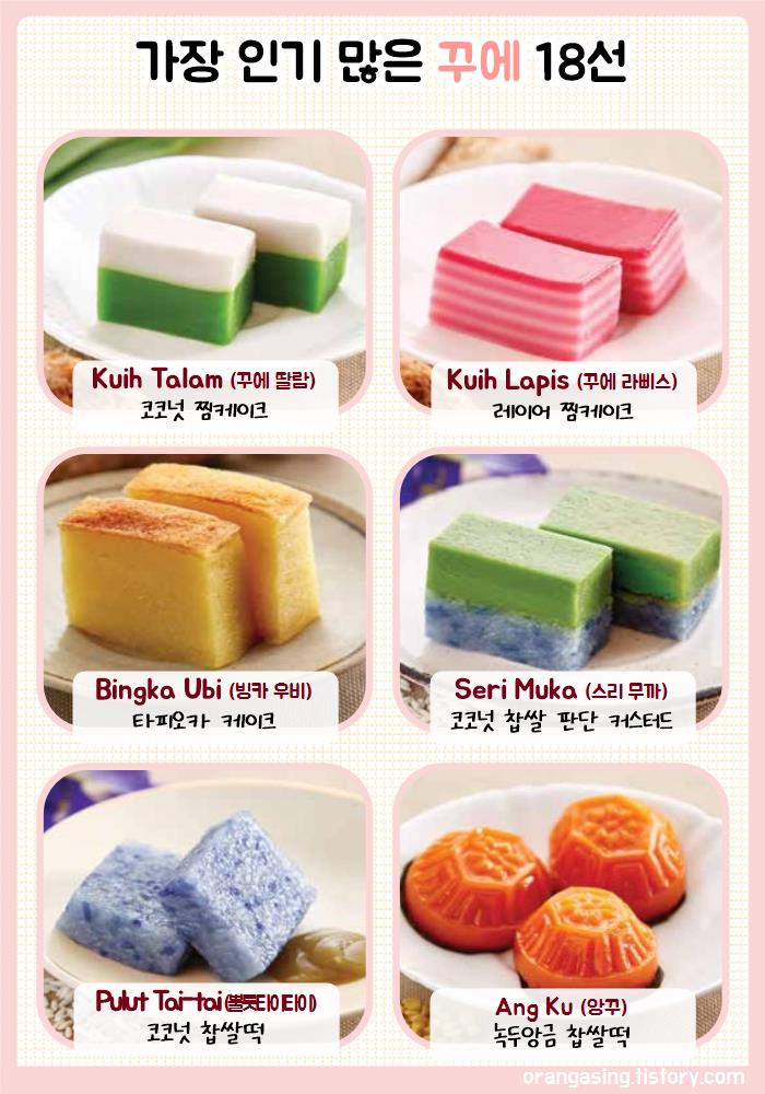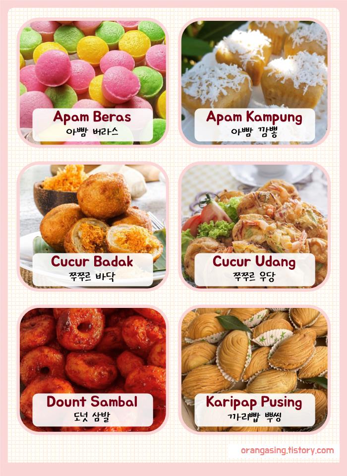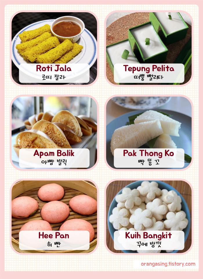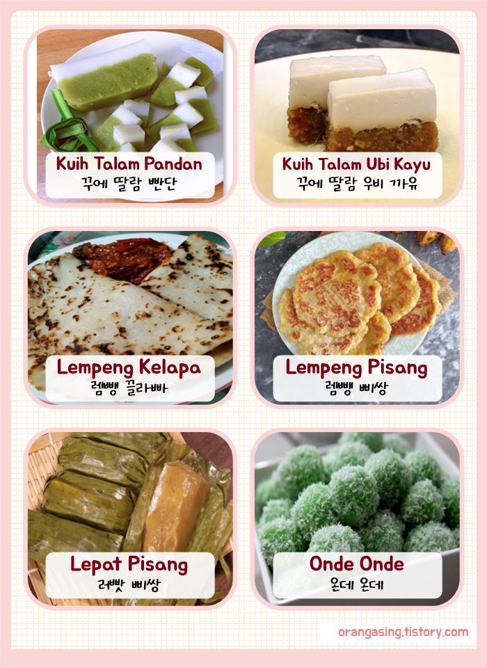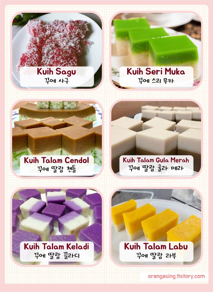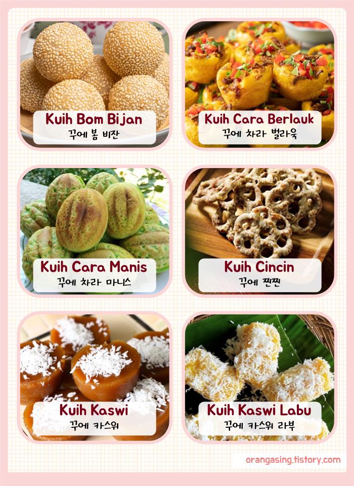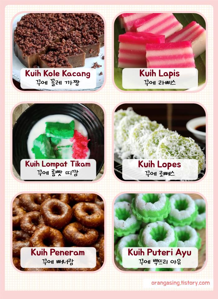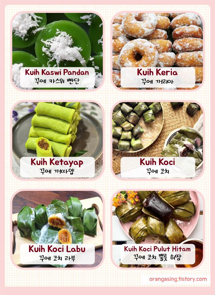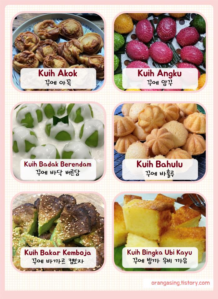 (말레이어로 단수는 'kuih', 복수는 'kuih-muih')