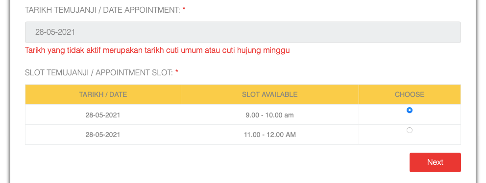 SLOT PADA TARIKH 31-05-2021 TELAH PENUH. PILIH TARIKH YANG LAIN